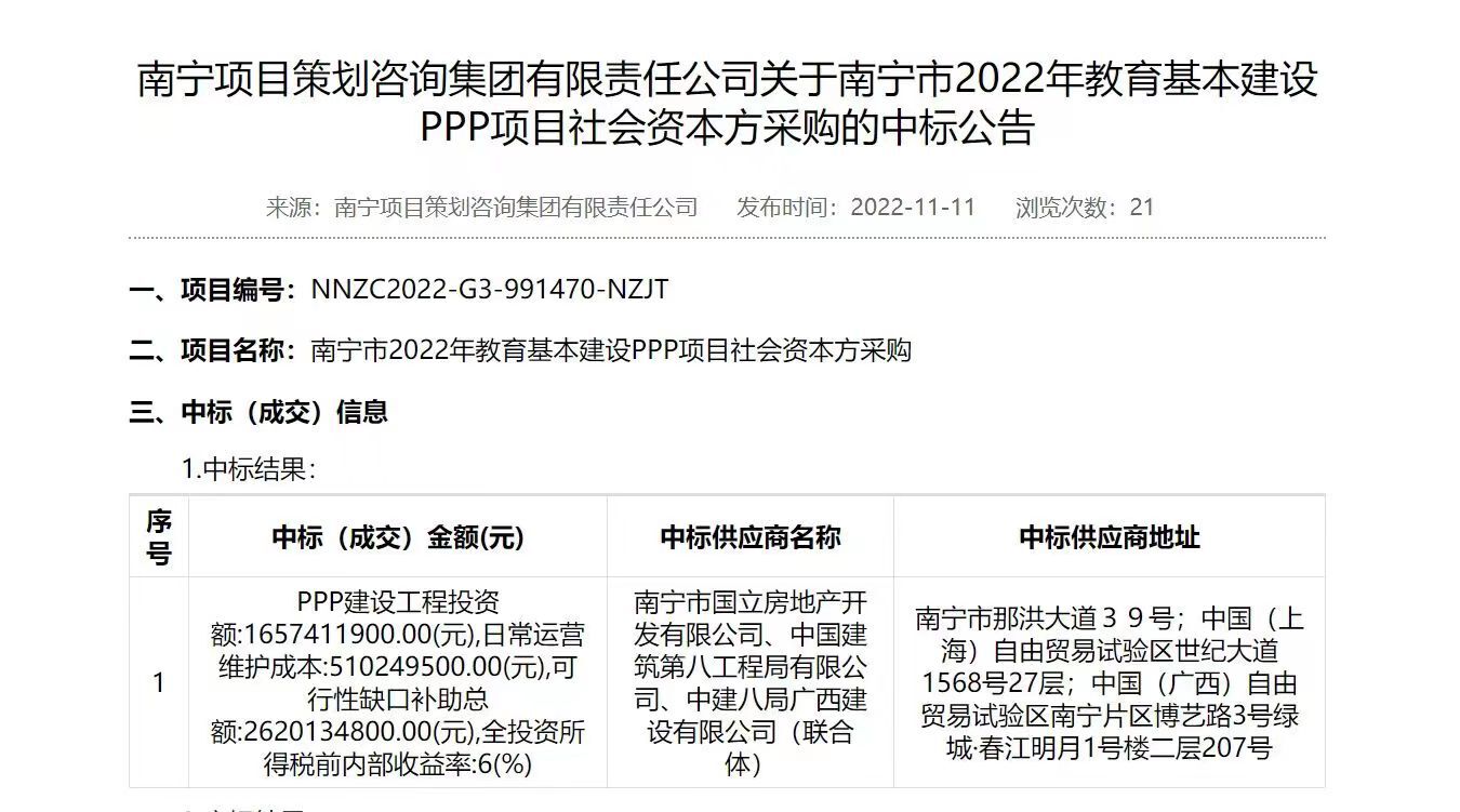 2022年11月11日,威寧房地產(chǎn)公司下屬監(jiān)管單位南寧市國立房地產(chǎn)開發(fā)有限公司(以下簡稱國立公司)牽頭與中國建筑第八工程局有限公司、中建八局廣西建設(shè)有限公司組成聯(lián)合體,以建設(shè)投資約16.57億元中標南寧市2022年教育基本建設(shè)PPP項目社會資本方。南寧市教育基建PPP項目社會資本方得以確定,是公司積極落實市委、市政府“體現(xiàn)教育優(yōu)先,新建一批高標準、高顏值的優(yōu)質(zhì)學校,打造品質(zhì)教育,實現(xiàn)‘學有優(yōu)教’”決策的重要行動。
