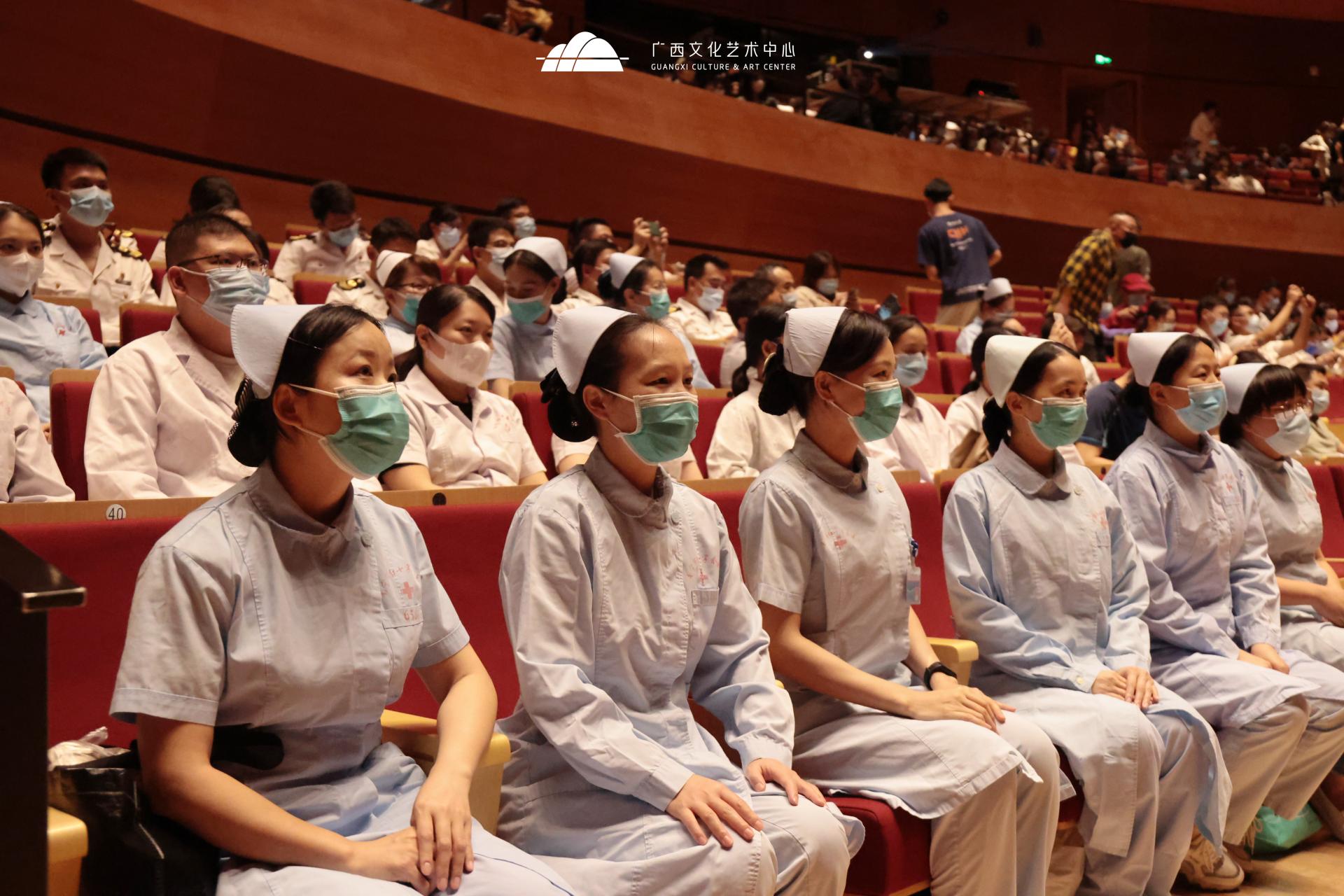 為充分發(fā)揮文藝“暖心”、文藝“聚力”的重要作用,實(shí)現(xiàn)疫情當(dāng)下“致敬英雄”,以實(shí)際行動(dòng)推動(dòng)演藝市場復(fù)蘇,今年,廣西文化藝術(shù)中心聯(lián)合南寧市衛(wèi)健委,特別邀請近500名醫(yī)護(hù)人員相聚劇場觀看大型民族舞劇《醒·獅》。這是廣西文化藝術(shù)中心自疫情發(fā)生以來連續(xù)第三年邀請抗疫一線醫(yī)護(hù)人員觀演,向我市奮戰(zhàn)在疫情一線的“最美逆行者”致敬。