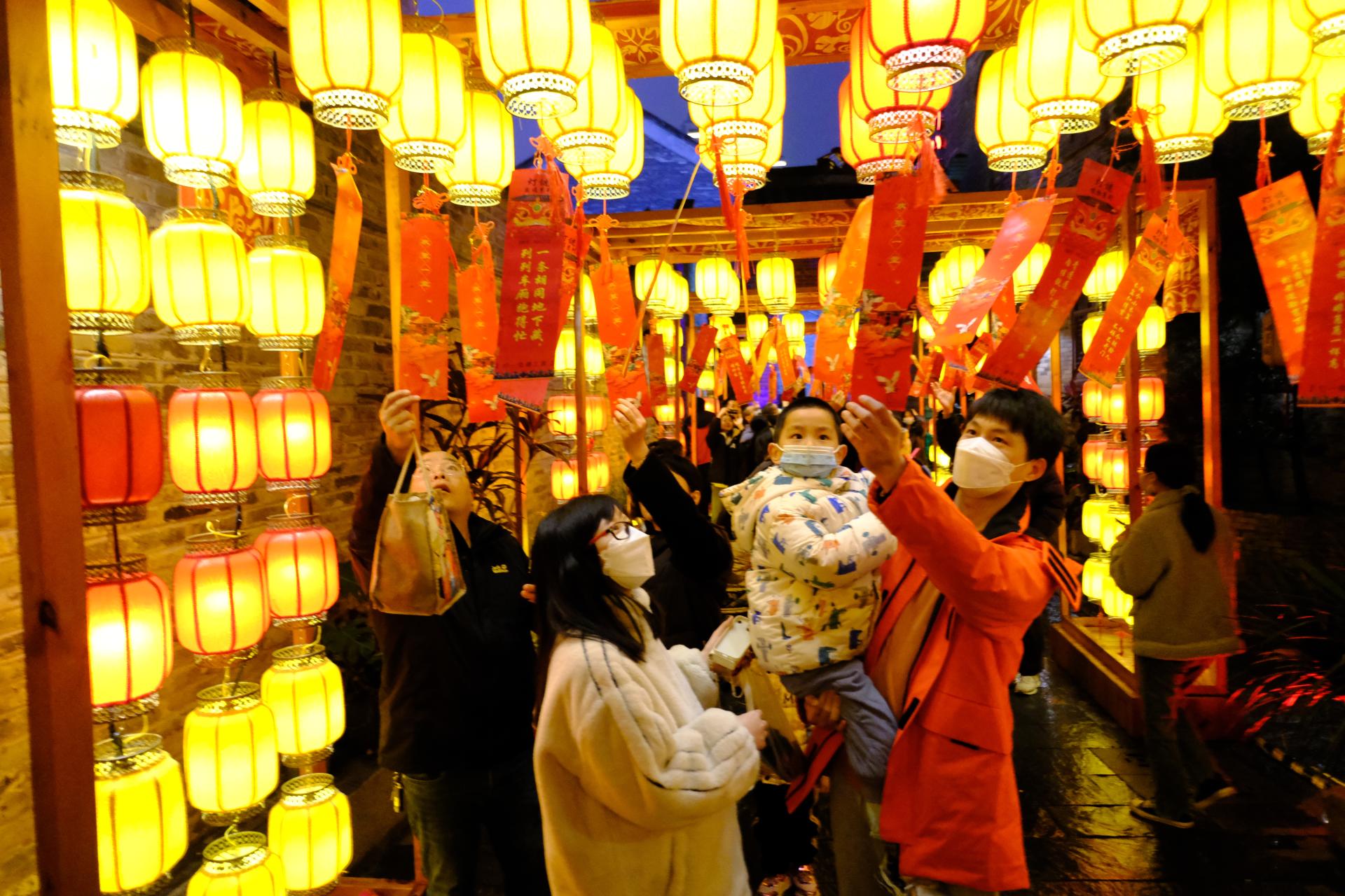 熱熱鬧鬧猜燈謎,祈福巡游過元宵。必不可少的是三街兩巷新春嘉年華活動的猜燈謎環(huán)節(jié)。威邕城市運營公司充分研判街區(qū)人流擁擠和街區(qū)導流問題,在人民劇院旁、銀龍巷游廊、新華水塔腳、城隍廟西巷設置4個燈謎區(qū),區(qū)域輻射街區(qū)一期、二期,既讓市民游客體驗猜燈謎有獎互動游戲,又能引導到街區(qū)各個區(qū)域。每個燈謎區(qū)人頭攢動,不少家庭游客聯(lián)翩而至,發(fā)揮聰明才智挑戰(zhàn)猜燈謎。謎面隨風起舞,游客穿梭其間,流連忘返。