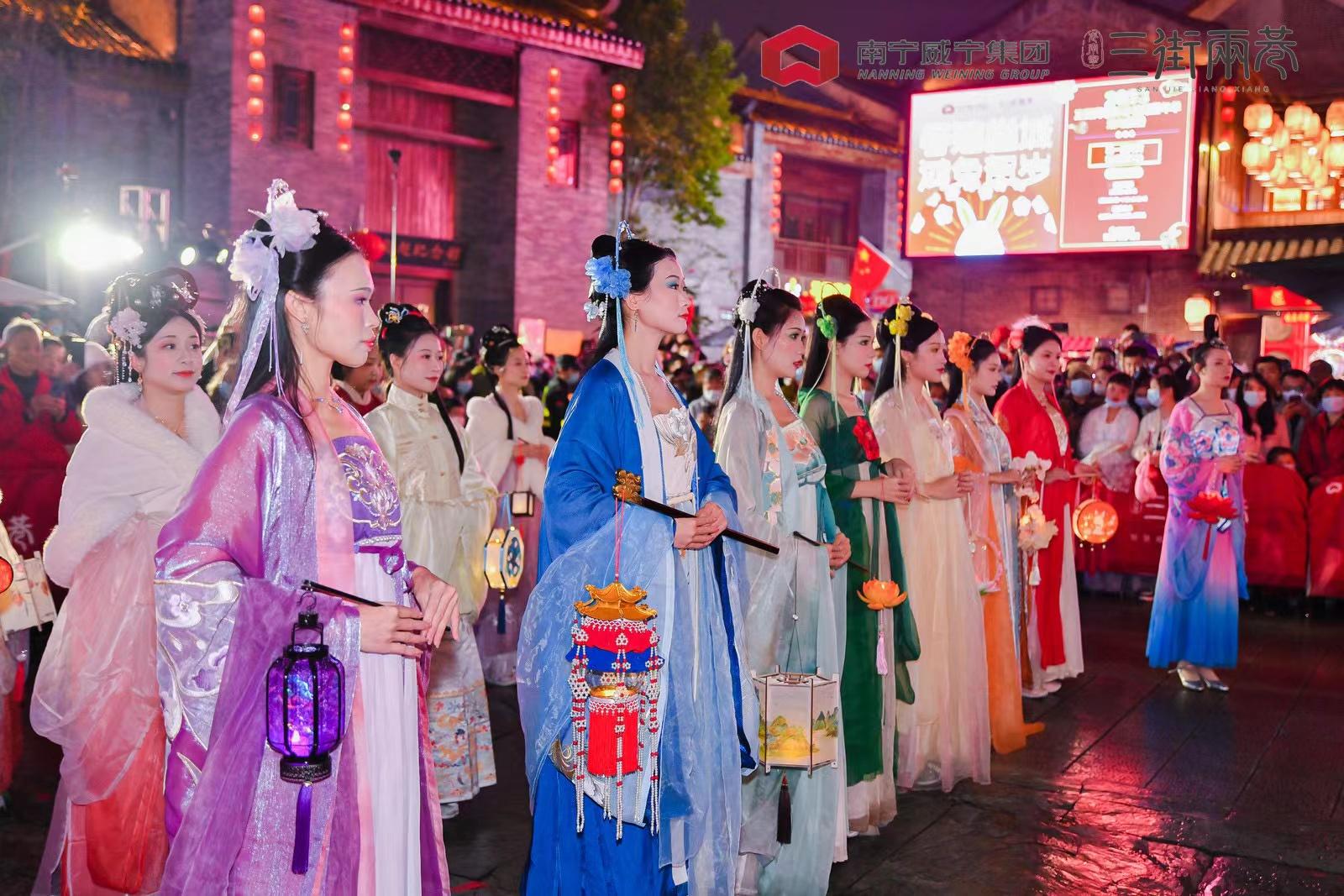 2月5日,三街兩巷花燈如晝,漢風溢彩華服流韻,2023三街兩巷新春嘉年華系列活動再次迎來新的高潮,元宵祈福巡游燈謎會火熱上演。大型非遺花燈、天仙賜福巡游、古風藝術表演、天仙祈福獻禮、花燈有獎猜謎,豐富的活動為市民游客帶來了歡樂喜慶的元宵節(jié)日體驗,也讓威邕城市運營公司三年來打造的春節(jié)活動品牌初見成效。活動當晚,廣西廣播電視臺新聞頻道、廣西日報-廣西云對活動盛況進行了全程直播,中央廣播電視總臺、人民網(wǎng)、廣西廣播電視臺、南寧廣播電視臺、南國早報、南寧晚報等十余家媒體進行報道。
