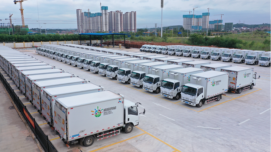 配送現(xiàn)場配送發(fā)車2020年11月2日,南寧市第一批50所公辦學(xué)校正式開始食材集中采購集中配送服務(wù)。首日配送食材數(shù)量達(dá)20噸左右,最長配送線路往返達(dá)136公里。配送前檢測出兩批次食材農(nóng)殘超標(biāo),涉及200千克左右蓮藕以及少量韭菜,配送前農(nóng)殘超標(biāo)食材已全部進(jìn)行處理,保障了學(xué)校的食材安全。11月2日凌晨2時(shí),位于五象新區(qū)的威耀供應(yīng)鏈公司五象配送基地現(xiàn)場燈火通明、熱火朝天,進(jìn)入正式配送前的臨戰(zhàn)狀態(tài):各學(xué)校食