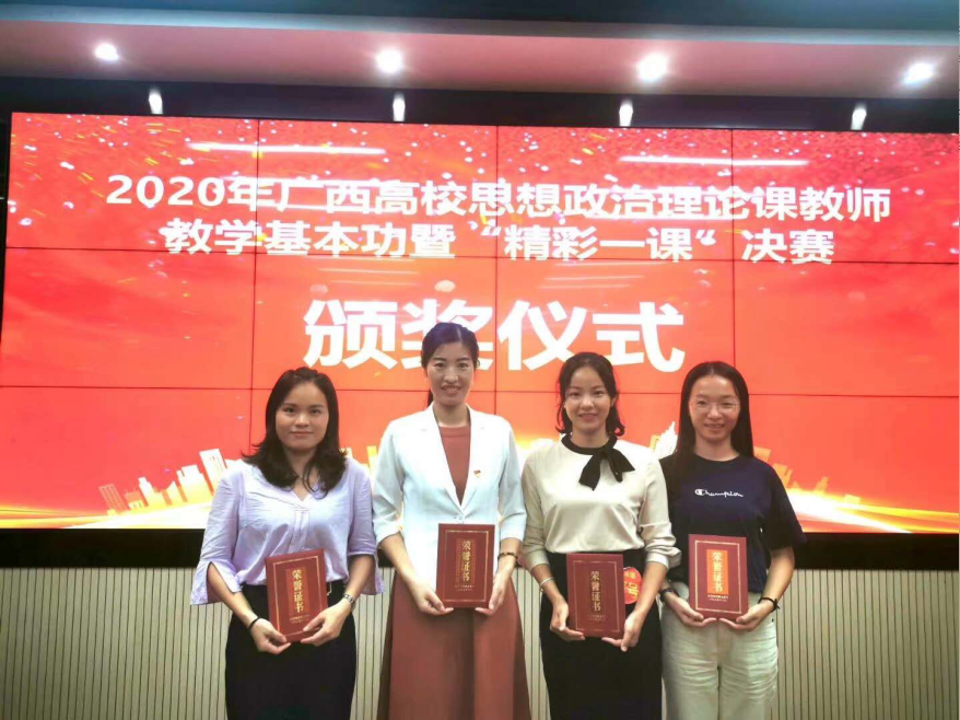 獲獎(jiǎng)教師合影近日,自治區(qū)教育廳剛剛公布2020年廣西高校思想政治理論課教師教學(xué)基本功暨“精彩一課”比賽獲獎(jiǎng)名單,南寧學(xué)院馬克思主義學(xué)院教師榮獲一等獎(jiǎng)1名,二等獎(jiǎng)1名,三等獎(jiǎng)4名,實(shí)現(xiàn)了南寧學(xué)院參賽教師全部獲獎(jiǎng)的喜人成績!為進(jìn)一步提升全區(qū)高校思想政治理論課教師的教育教學(xué)能力,由自治區(qū)黨委教育工委、自治區(qū)教育廳主辦,廣西大學(xué)承辦的2020年廣西高校思想政治理論課教師教學(xué)基本功暨“精彩一課”比賽,自6月