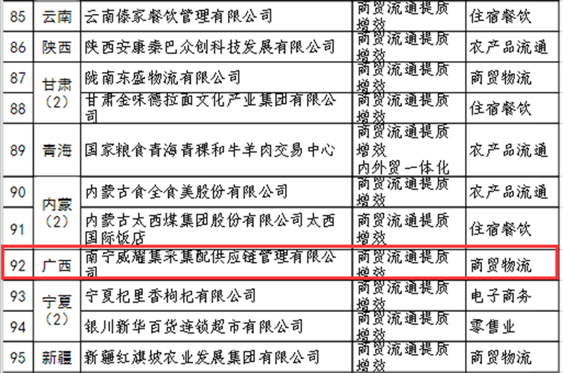 8月5日,國家商務(wù)部和市場監(jiān)督管理總局公示“國家級(jí)服務(wù)業(yè)標(biāo)準(zhǔn)化試點(diǎn)(商貿(mào)流通專項(xiàng))”評(píng)審結(jié)果,威耀供應(yīng)鏈公司是廣西唯一一家入選企業(yè)。