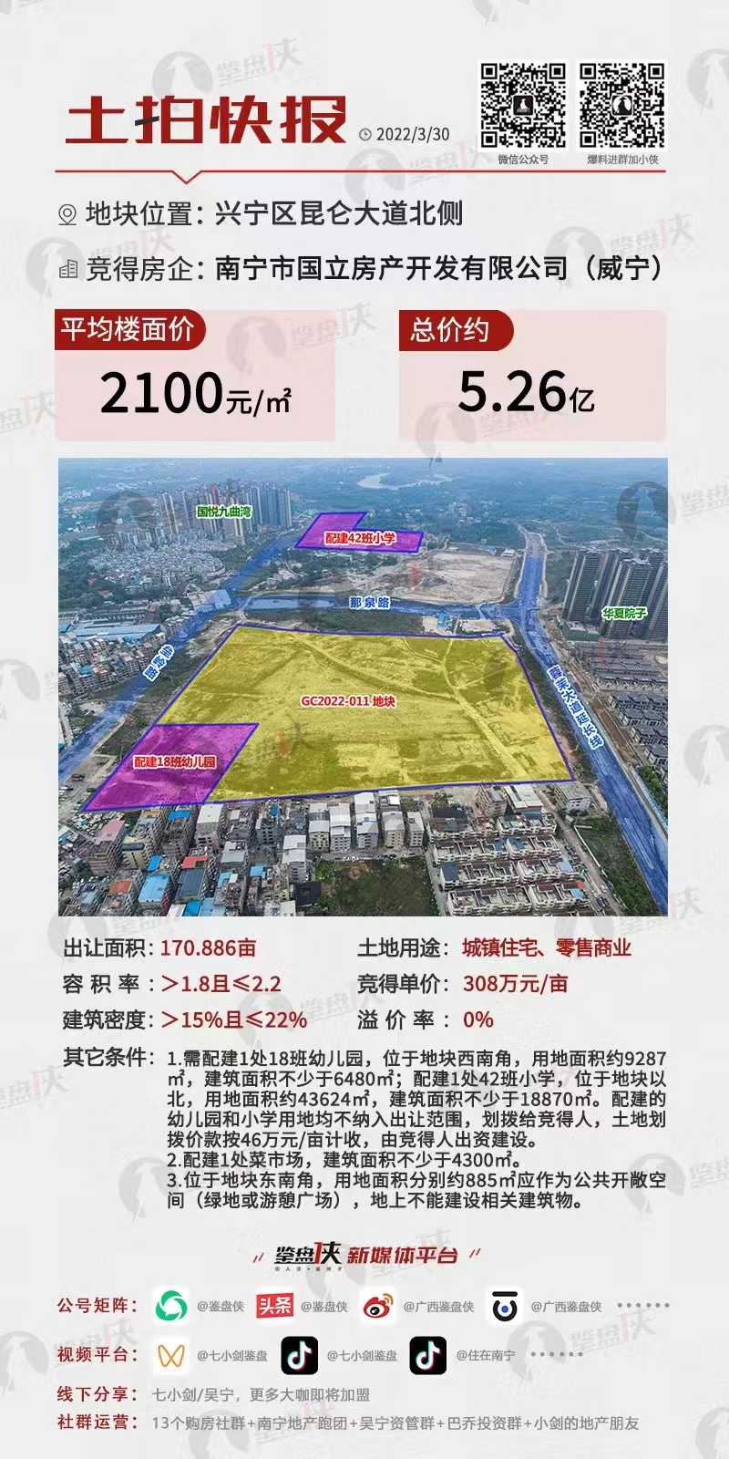 2022年3月30日,威寧房地產公司監(jiān)管單位國立公司以5.26億元成功斬獲南寧市興寧區(qū)昆侖大道北側地塊,成交單價308萬元/畝,樓面價2100元/㎡。