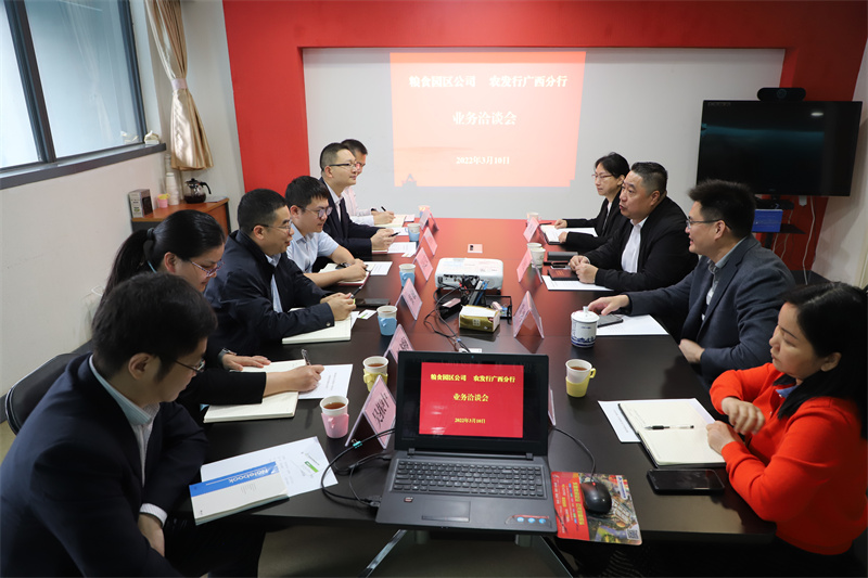 2022年3月10日上午,農發(fā)行廣西區(qū)分行糧棉油與產業(yè)客戶處處長韋敏率隊到糧食園區(qū)公司洽談園區(qū)項目物流中心工程建設融資合作事宜